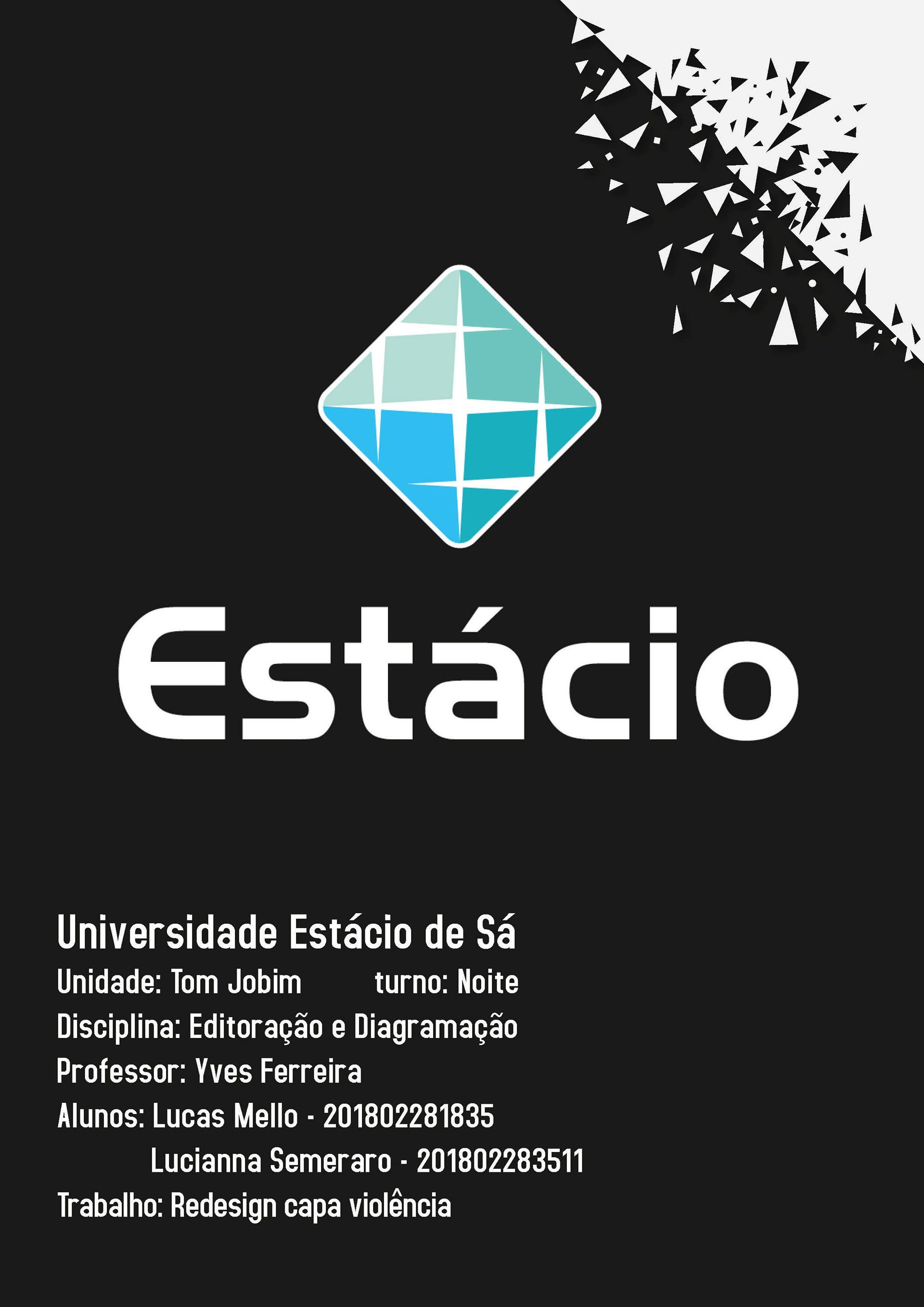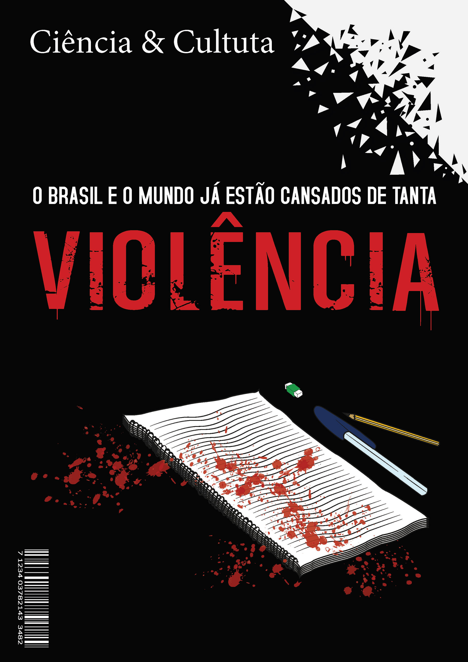 Justificativa do redesign da Capa Violência Primeiramente este projeto de diagramação, desenvolvido em parceria com Lucianna Monteiro para a faculdade, pensamos em retratar na capa algo que chamasse a atenção do leitor como foi a tragédia que aconteceu em Suzano no dia 13 de março, como o trabalho foi passado no dia 15 estávamos todos muito abalados ainda com esta situação, na verdade essa tragédia que nunca será esquecida. Pela tragédia ter acontecido dentro de uma escola, optamos por dar destaque ao centro da capa e colocamos um caderno com alguns respingos de sangue, no intuito de impactar o leitor com a violência que aqueles estudantes sofreram. Além do caderno colocamos um lápis, uma caneta e uma borrada para simbolizar melhor os estudantes. A capa em seu total a gente queria que ficasse bem limpa, porém passando todos os sentimentos de tristeza e brutalidade pelo que aconteceu com os estudantes. No título da revista ”Ciência & Cultura” tentamos utilizar uma fonte a fim de retratar o mais próximo a fonte utilizada na realidade, embora esta revista não tem um logo especifica varia de acordo com o tema proposto cada edição tem praticamente sua logo diferenciada. Para o título da matéria escrevemos “Violência” com uma fonte com alguns detalhes como se ela estivesse machucada, danificada. Utilizamos outra fonte no complemento ‘O Brasil e o mundo já estão cansados de tanta’ mais uma fonte que complementasse a do titulo principal e que passasse o mesmo sentimento. Para dar um detalhe a mais colocamos uma parte no canto superior direito uma espécie de como se fosse o vidro de uma janela despedaçando com um tiro, para retratar as diversas janelas que foram alvejadas de tiros na tragédia de Suzano.