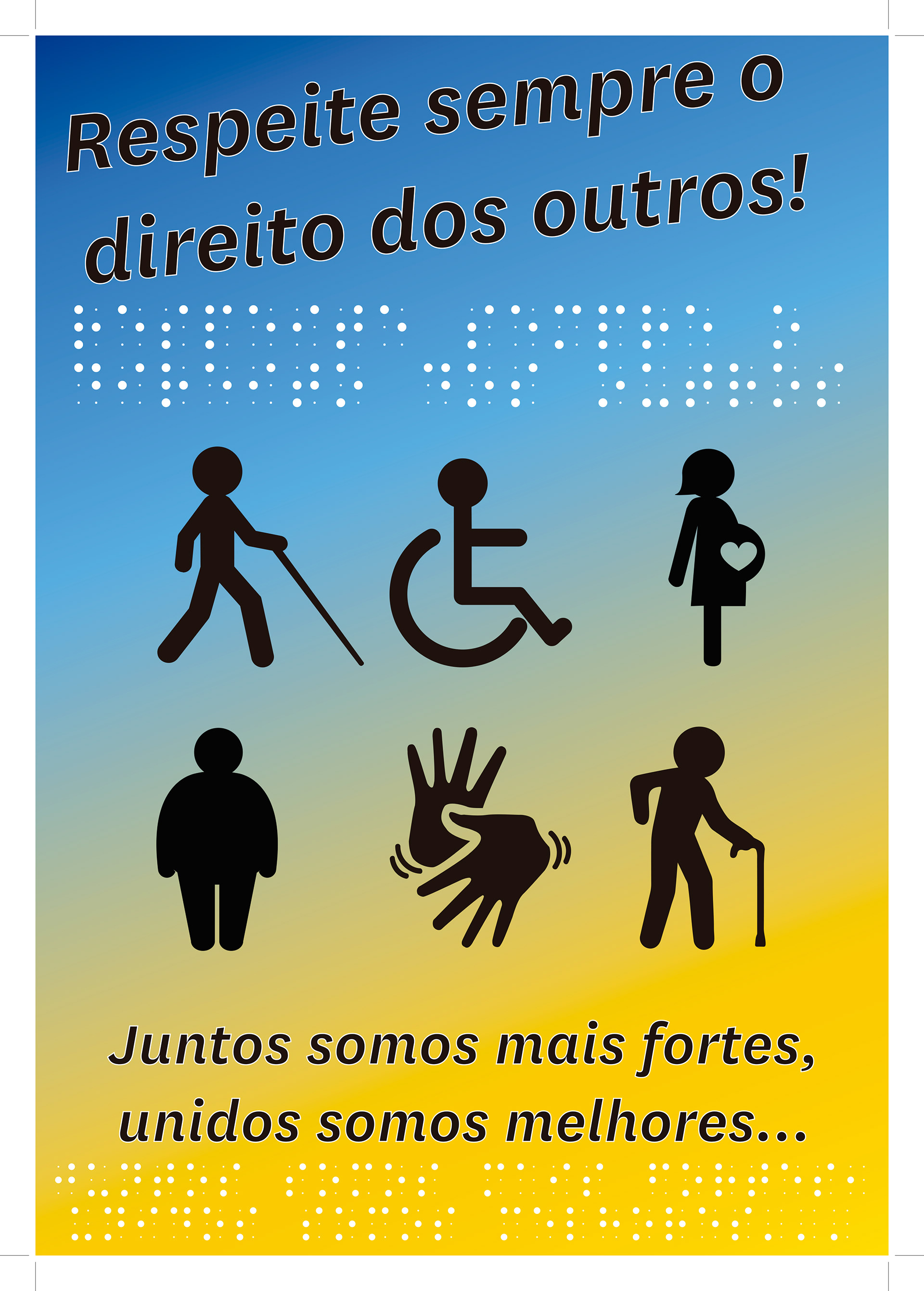Este projeto, desenvolvido em parceria com Lucianna Monteiro, teve como desafio criar uma peça de comunicação visual que fosse, acima de tudo, inclusiva. O cartaz traz a mensagem potente: 'Respeite sempre o direito dos outros! Juntos somos mais fortes, unidos somos melhores...', mas nossa preocupação foi garantir que essa mensagem chegasse a todos. Para isso, implementamos um sistema de linguagem dupla: o texto impresso para videntes e a transcrição em Braille para pessoas com deficiência visual. O diferencial técnico e sensorial deste trabalho foi o uso de cola 3D para criar o relevo das bolinhas do Braille sobre a impressão. Essa técnica artesanal permitiu que o cartaz fosse lido através do tato, transformando uma peça gráfica em uma experiência sensorial de inclusão e respeito.